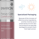 Environ Focus Care Comfort+ Vita-Enriched Antioxidant Gel is a special cocktail of high antioxidant vitamins C and E, Beta-Carotene, and provitamin B5, in a non-greasy formula.