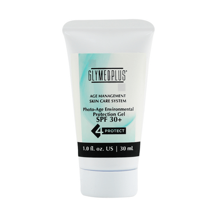 Glymed Plus Photo-Age Environmental Protection Gel 30+ prevents environmental aging and sun-damage with broad-spectrum protection against the harmful UVA/UVB rays of the sun. Blending perfectly with any makeup, skin care, or shaving product, the bio-blended formula works to protect all skin types.