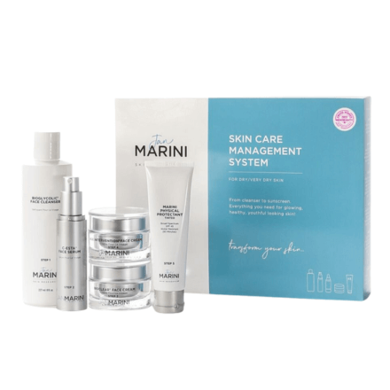 Cleanse on dry skin with Bioglycolic® Face Cleanser. Rinse thoroughly.Pump your Vitamin-C serum, C-ESTA® Face Serum, into your palm and apply sparingly to rejuvenate your skin.All’s Clear with Bioclear! For normal skin, apply Bioclear® Face Lotion, for dry skin, apply Bioclear® Face Cream sparingly to the entire face.Hydrate your skin with Transformation Face Cream, for normal skin and Age Intervention® Face Cream, for dry. Apply sparingly over entire face.Finish your routine with the ultimate SPF protection. Antioxidant Daily Face Protectant OR Marini Physical Protectant. Reapply every 2 hours throughout the day. Not needed at night.
