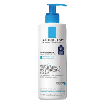 This triple repair body cream moisturizer (formerly Lipikar Balm AP+) is clinically shown to reduce dry, rough skin and provide 48 hour hydration. Formulated with dermatologist recommended ingredients including La Roche-Posay Prebiotic Thermal Water, Ceramide-3, Shea Butter, Glycerin, and Niacinamide. Its triple action helps rebalance the skin microbiome, restore the skin’s protective barrier and replenish the skin’s lipids to provide daily relief for dry skin.