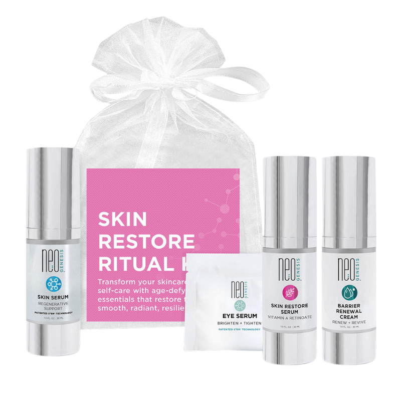 The NeoGenesis Skin Restore Ritual Kit is an advanced daily regimen designed to promote radiance, resilience, and smoother-looking skin. Powered by patented S²RM® exosome technology, skin-native molecules, and barrier-supporting hydration, this curated set elevates your skincare routine with age-defying benefits. Featuring the Skin Restore Serum—infused with stabilized Vitamin A and antioxidants—this ritual helps improve the look of fine lines, elasticity, and overall vitality, all while being gentle on sensitive skin. Includes an Eye Serum sample to complete your renewal ritual.
