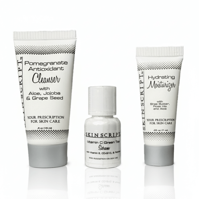 The Skin Script Dry Skin Sample Kit is a hydrating trio curated to restore softness, elasticity, and glow to dry or dehydrated complexions. This kit features three of Skin Script’s most-loved formulas — the Pomegranate Antioxidant Cleanser, Vitamin C/Green Tea Serum, and Hydrating Moisturizer — designed to cleanse, protect, and deeply replenish the skin barrier.